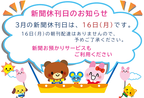 お知らせ 2026-2-27 3月の新聞休刊日は、16日(月)です。ご利用ください 新聞お預かりサービス